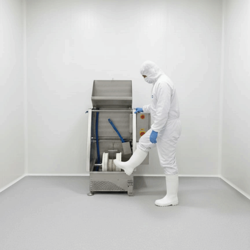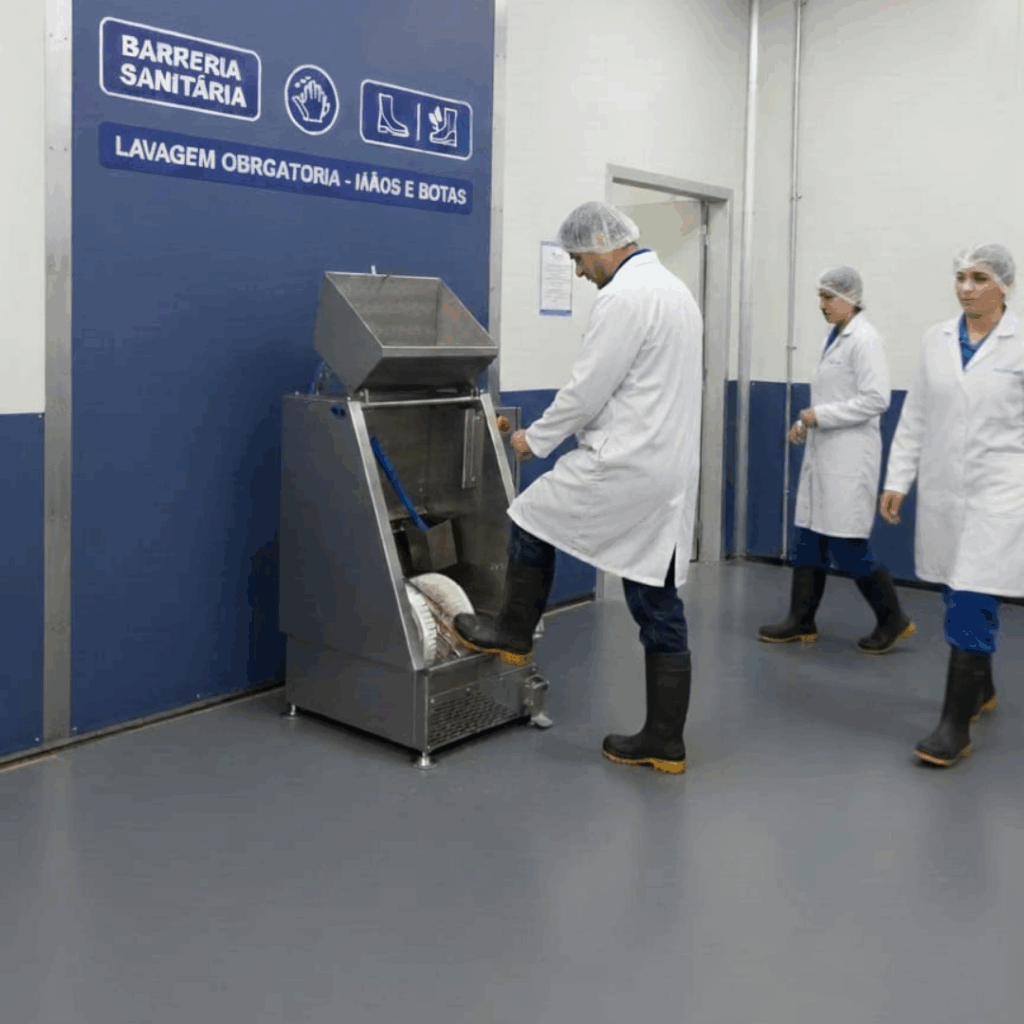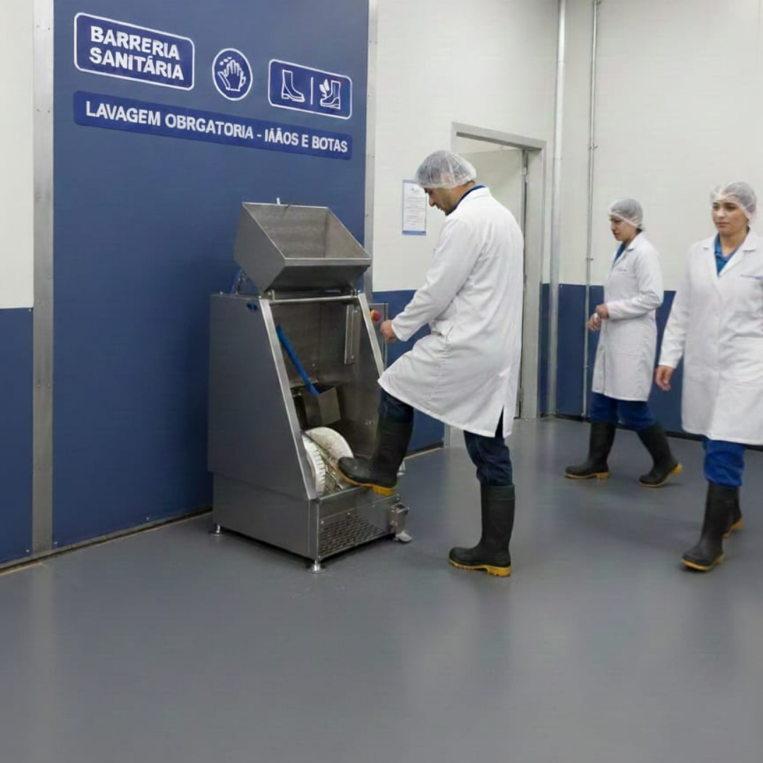 Sistema de lavagem de botas com cerda rotativa (acionamento por sensor) + escova manual auxiliar, e lavatório de mãos com acionamento robusto via pedal.