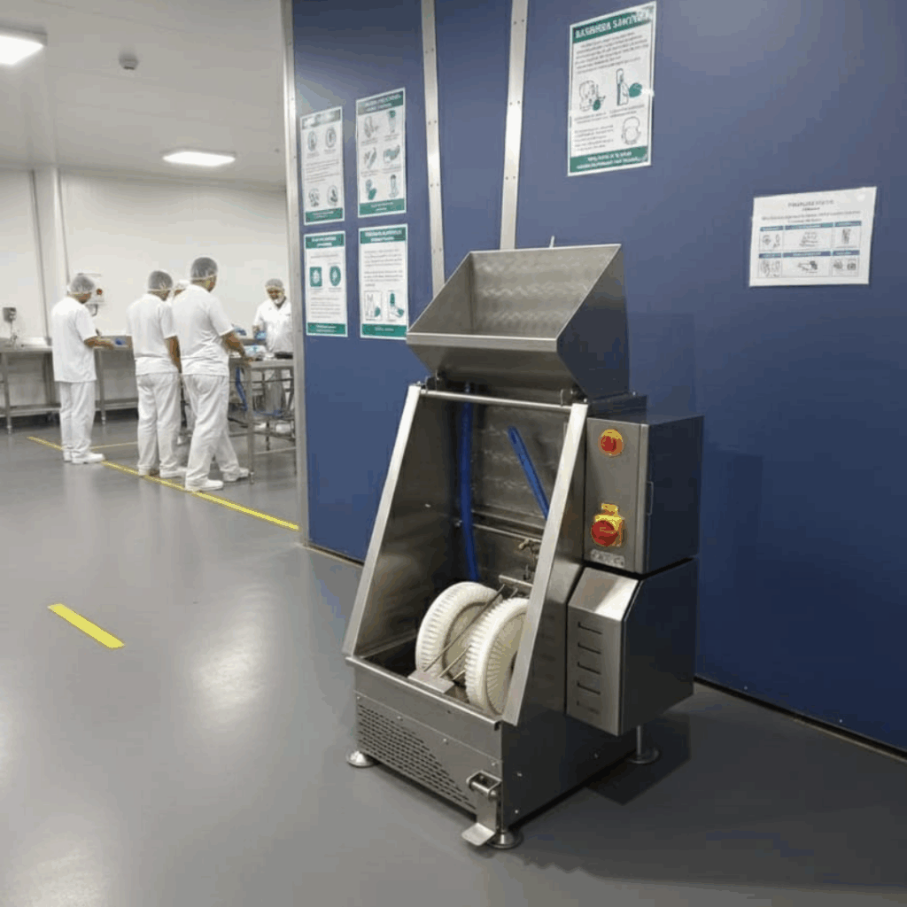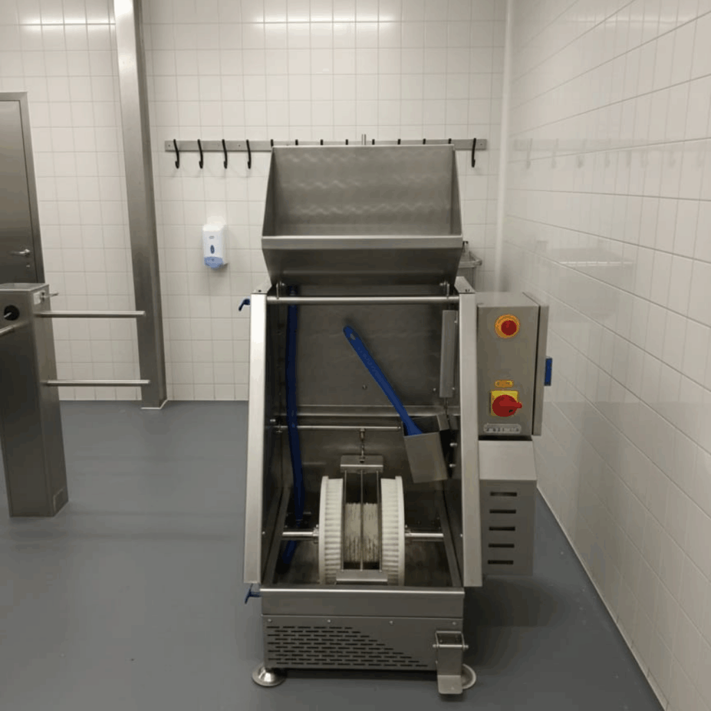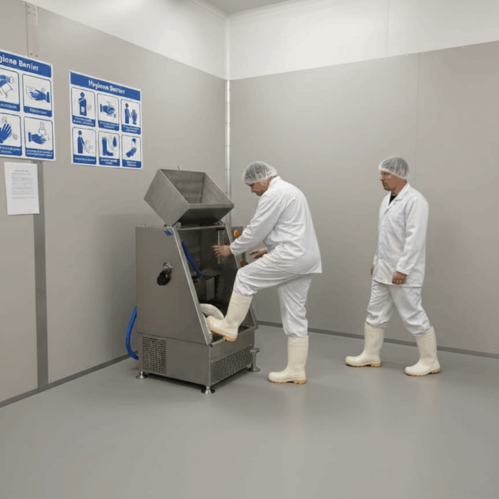 Sistema de lavagem de botas com cerda rotativa (acionamento por sensor) + escova manual auxiliar, e lavatório de mãos com acionamento robusto via pedal.