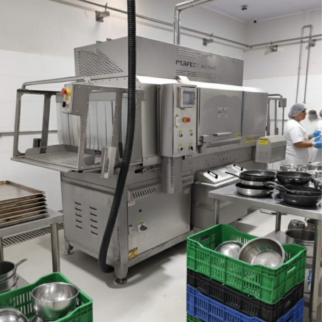 A Perfect Washer é uma lavadora automática contínua e multitarefas, construída para o ritmo acelerado de ambientes de alta demanda. Equipada com jatos de água de altíssima pressão e temperatura, um ciclo rápido programável e um robusto transportador de utensílios, ela lida com bandejas, panelas, caixas e talheres em um fluxo ininterrupto. Sua estrutura em aço inoxidável de grau industrial garante resistência ao uso constante e conformidade sanitária.